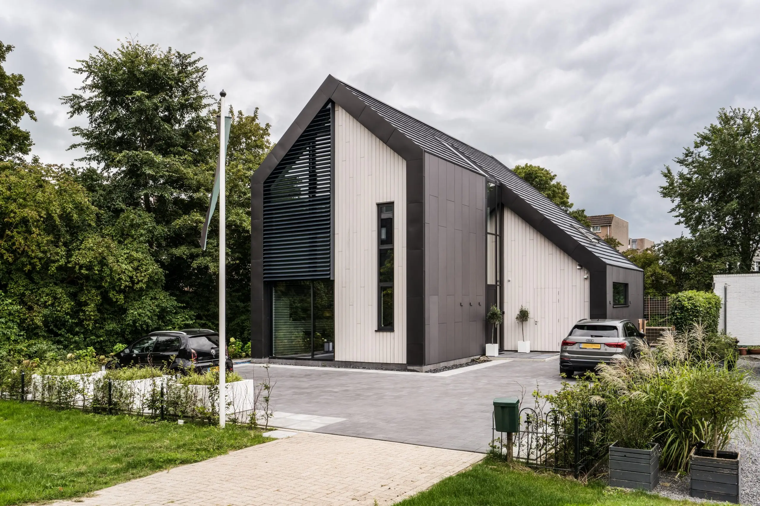 Deze houtskeletbouw nieuwbouwwoning combineert duurzaamheid met een moderne uitstraling. Het Kingspan Unidek dak is volledig bedekt met zonnepanelen, terwijl Dumowood gevelbekleding, zinken kaders en zinken gevels zorgen voor een strak geheel. Binnen springt de stijlvolle Korian trap in het oog. Aluminium kozijnen maken de woning compleet én onderhoudsvriendelijk.